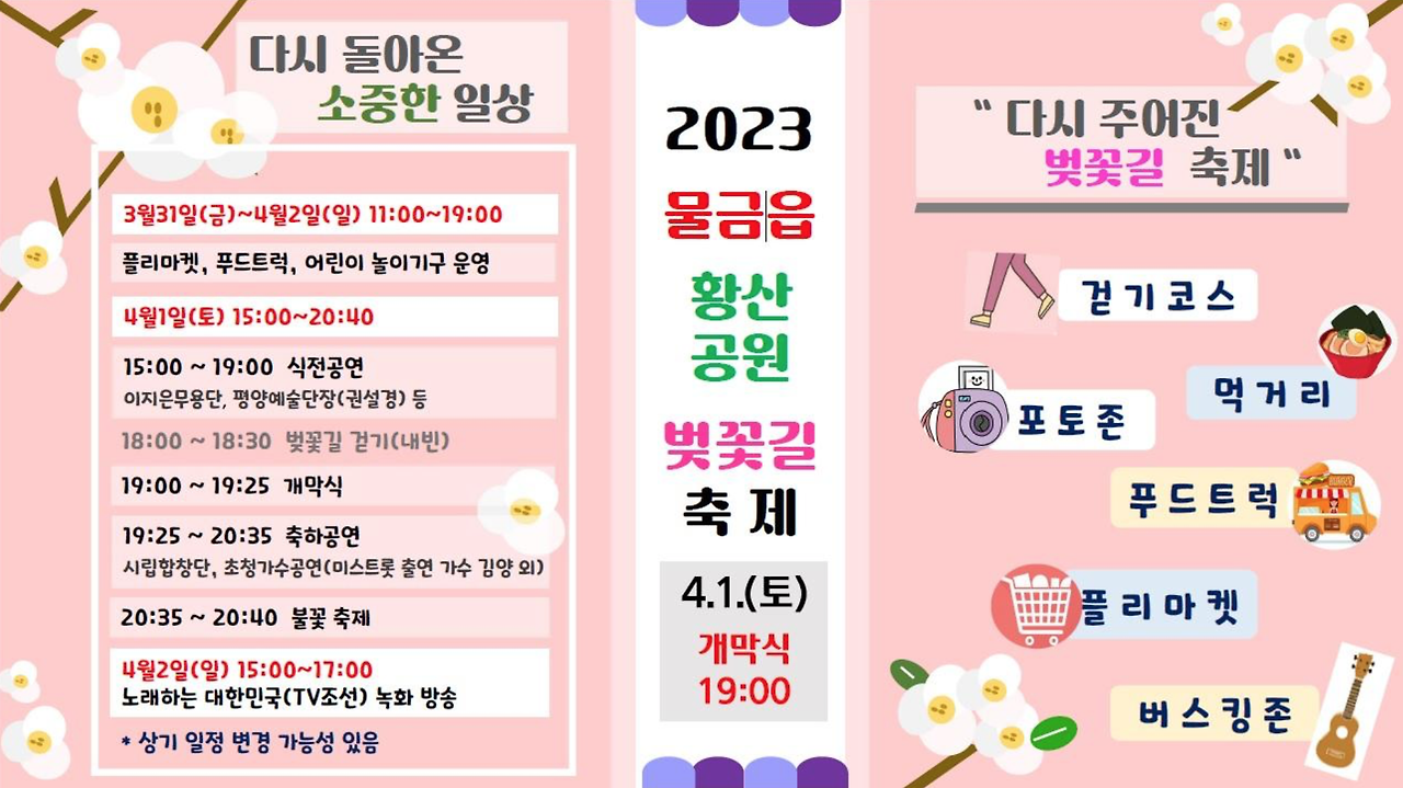 예년과 비슷한 3월 30일(토) ~ 31일(일) 이틀간 개최되는데요. 개막식, 축하공연, 참여프로그램, 푸드존, 테마존 등 작년과 마찬가지로 즐길거리 볼거리 먹을거리로 풍성한 축제를 예상하고 있습니다.