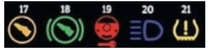 21. 타이어 공기압 경고 Tire pressure monitoring system : 타이어의 공기가 빠지면 생기는 경고등입니다. 급속으로 공기가 빠진다면 운전에 위험한 상황이 발생하므로 차를 세우고 대책을 마련해야 합니다.