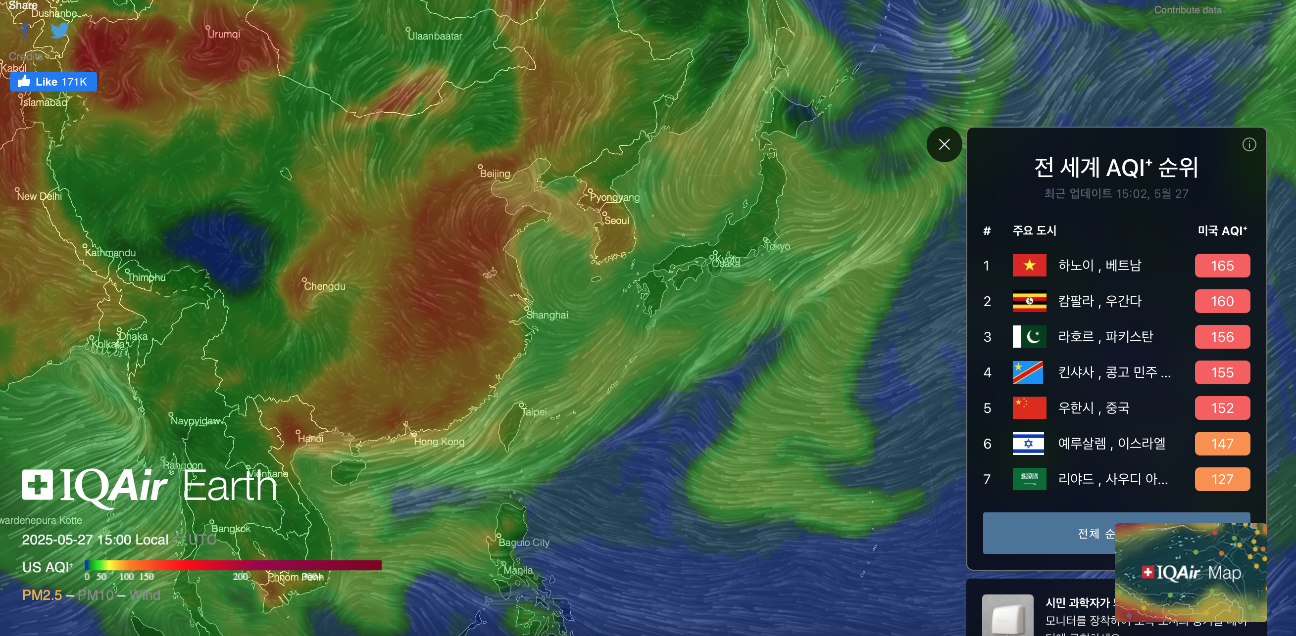 IQ Air에서는 선명하고 직관적으로 미세먼지 지수를 제공하고 있습니다. 또한 세계 공기질 순위를 보여주고 있어 전체적인 미세먼지 상황을 알기 쉽게 보여주고 있습니다.