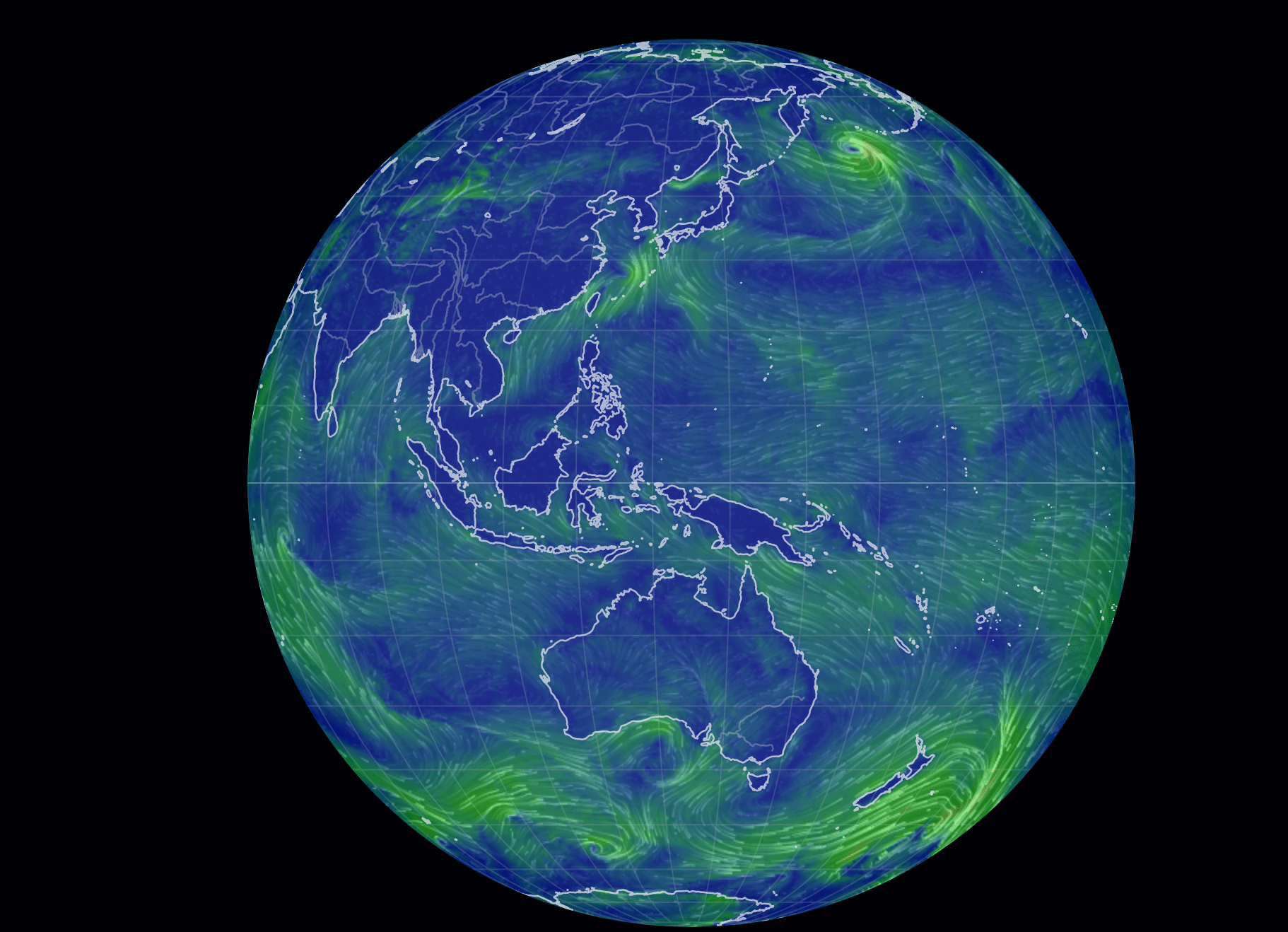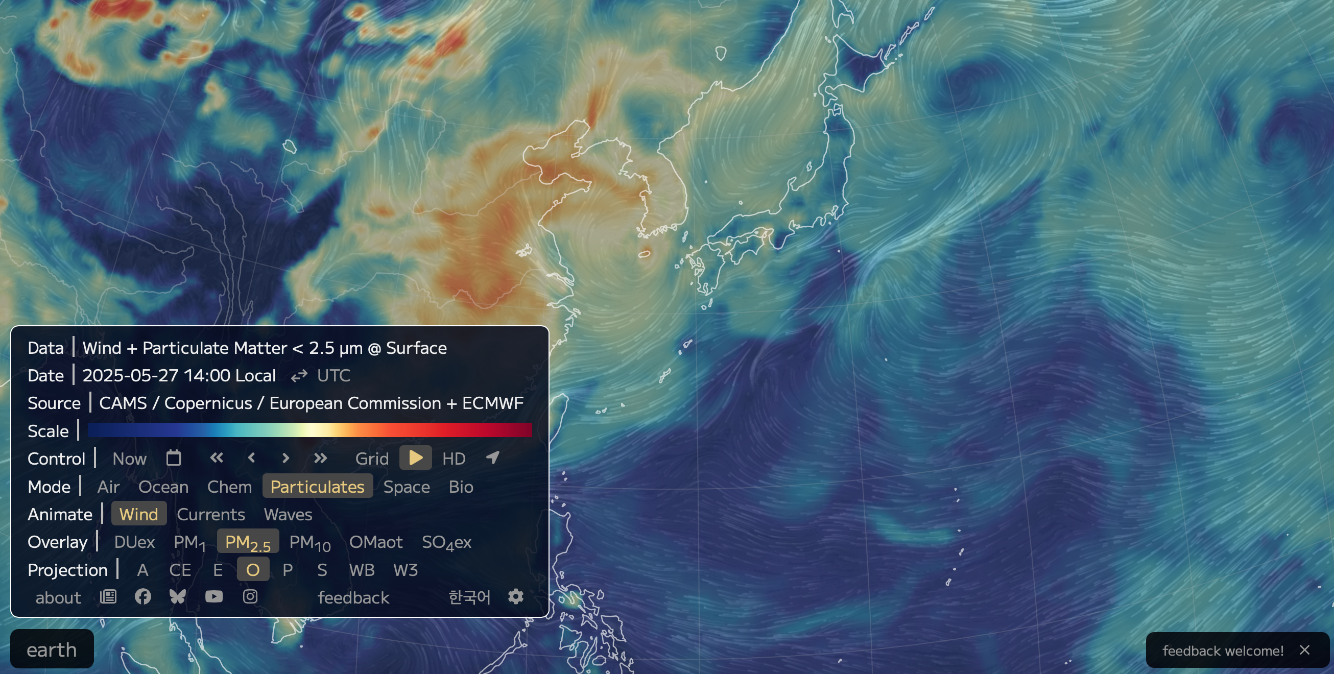 어스널스쿨은 슈퍼컴퓨터로 예측한 기상 흐름을 지구본 형태의 지도로 보여주는 사이트인데요. 미세먼지 뿐 만 아니라 태풍 해류 등 흐름을 표현하고 있습니다.